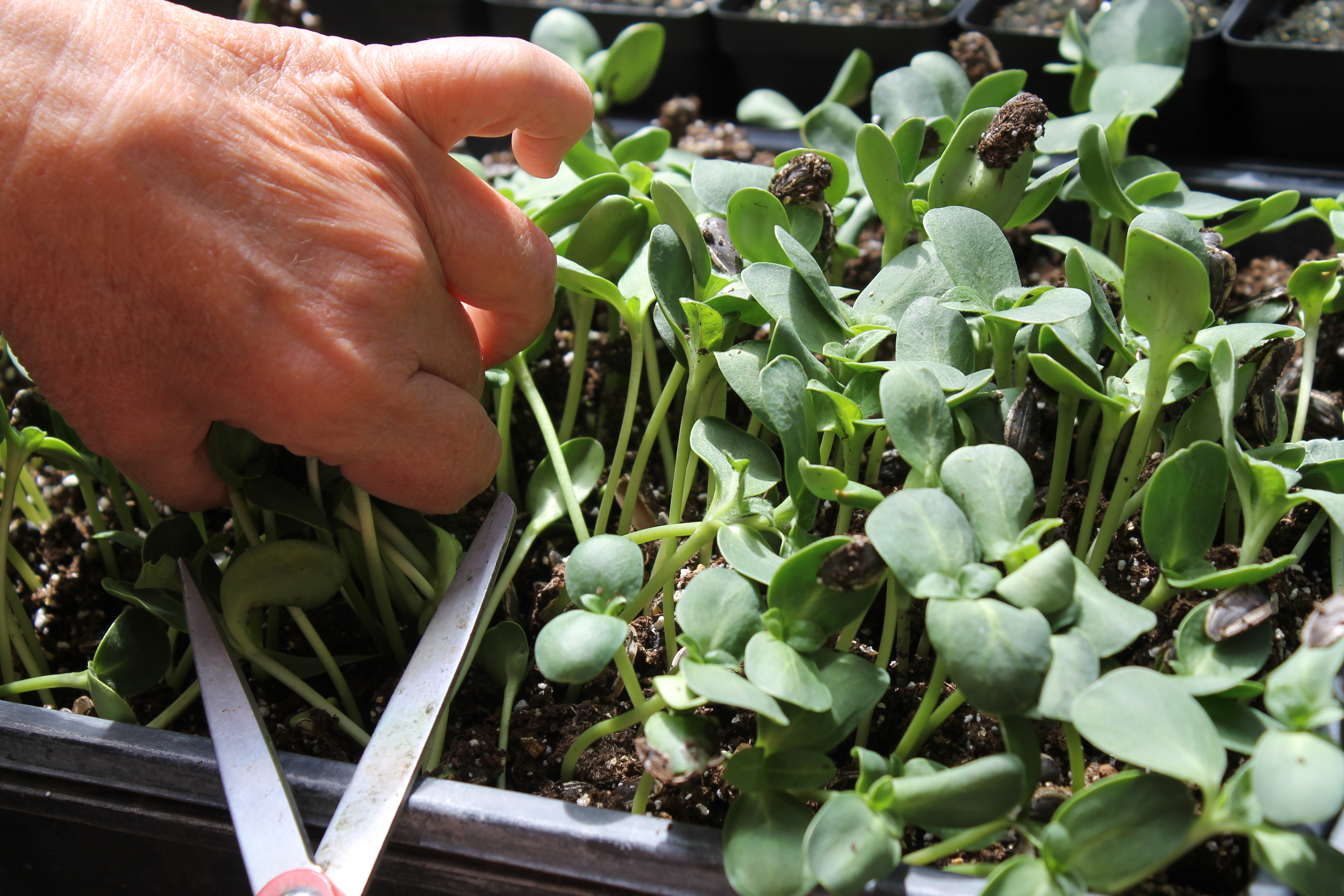 Sow your chosen seed THICKLY in your chosen container (you don’t really even need to have holes in the bottom but I use plastic or wooden flats).
