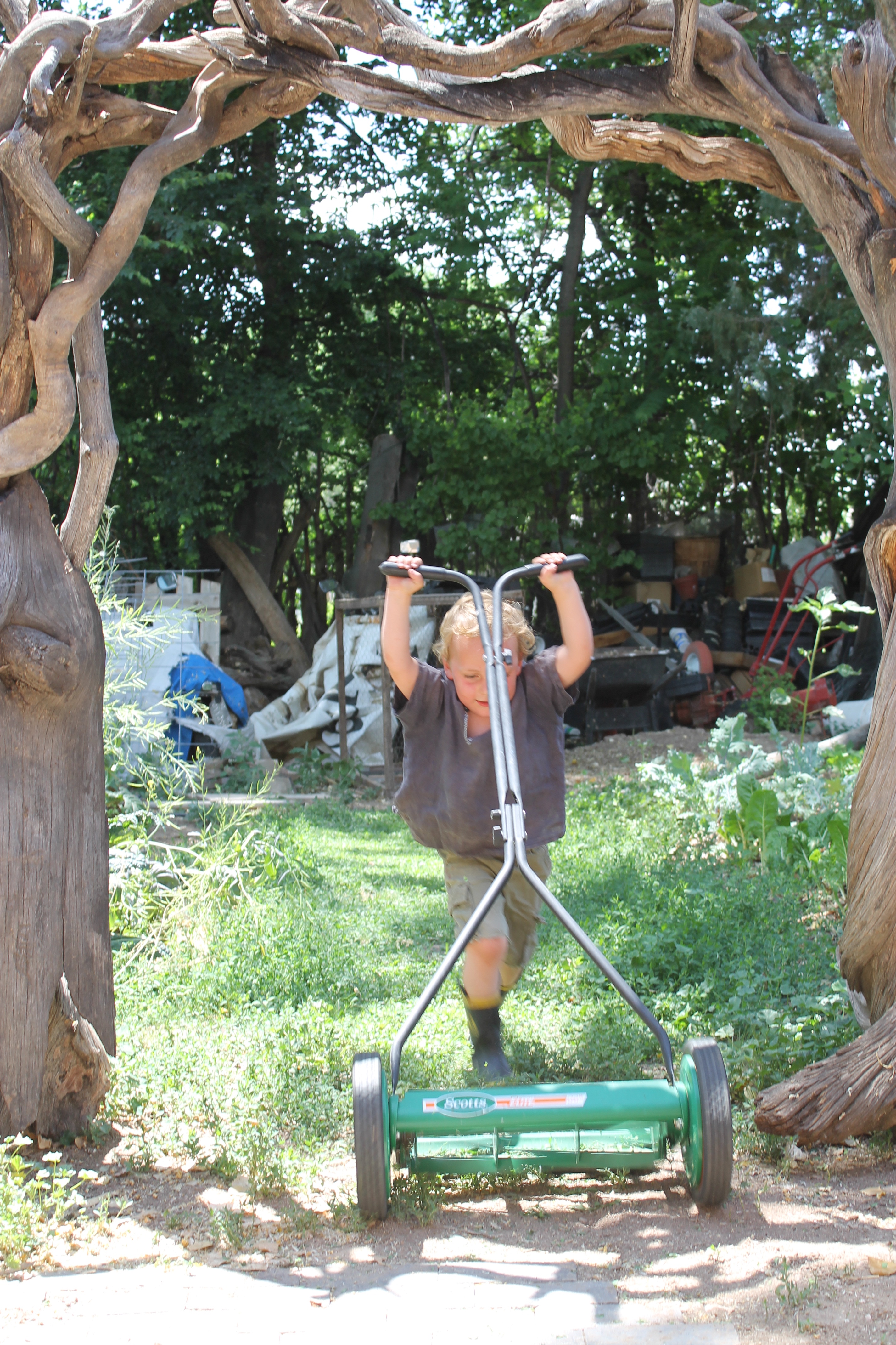 Here in the desert lawns are rare and now that I have barefoot children of my own I see the great need to have open soft green spaces for them to run and roll and rest in. So this year has been the year of the lawn. I probably wouldn’t have thought of it, but my son did. In fact he asked for a lawn mower first, which he was gifted by a dear friend…but once he brought it home he realized it was not much fun on our weedy dirt…So we planted the boy a lawn.