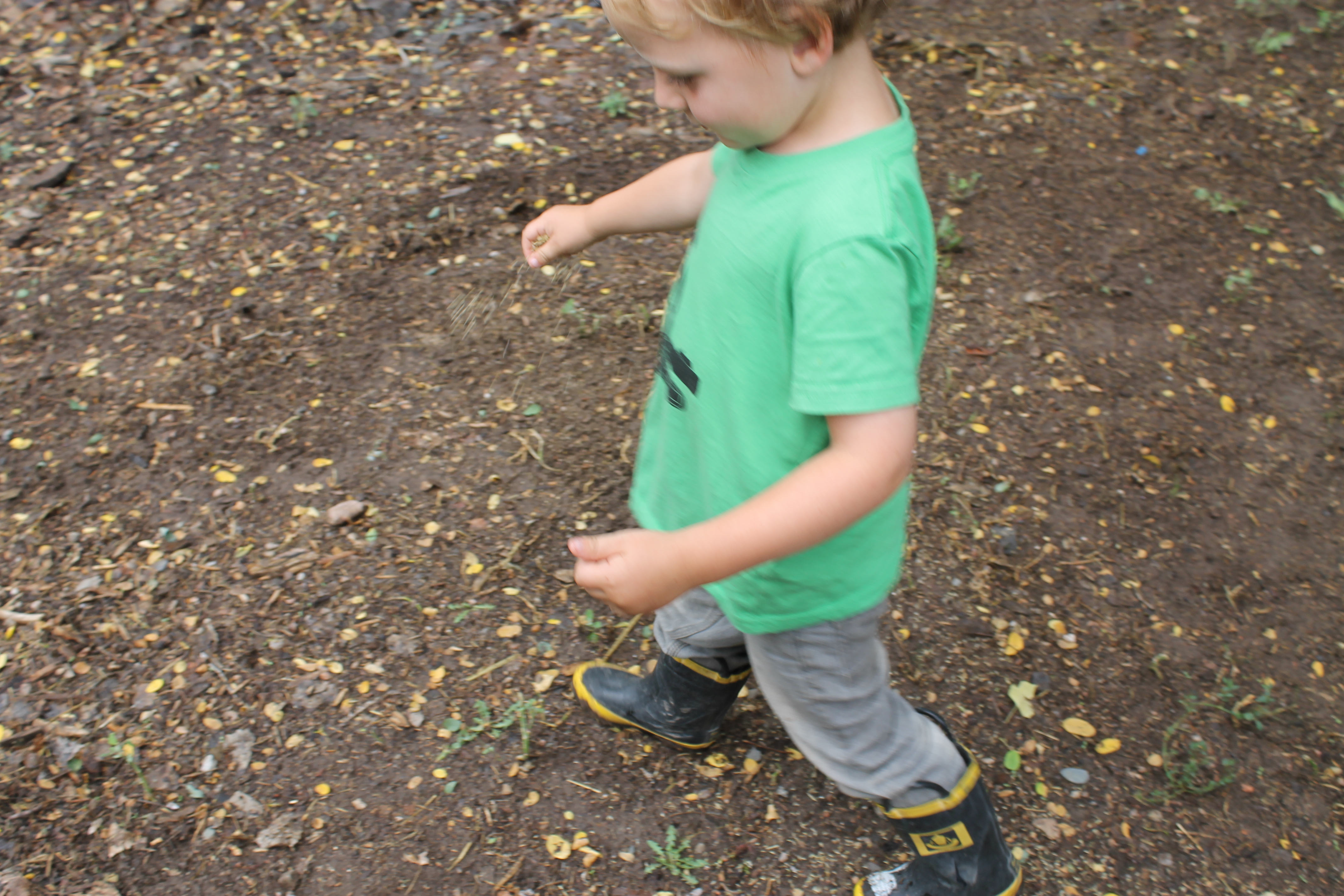 raked some more and covered with a bit of loss dirt from a pile we had and danced around on it. The seeds of course need contact with the dirt and all like to be watered to begin with- and in this rain are sprouting up beautifully.