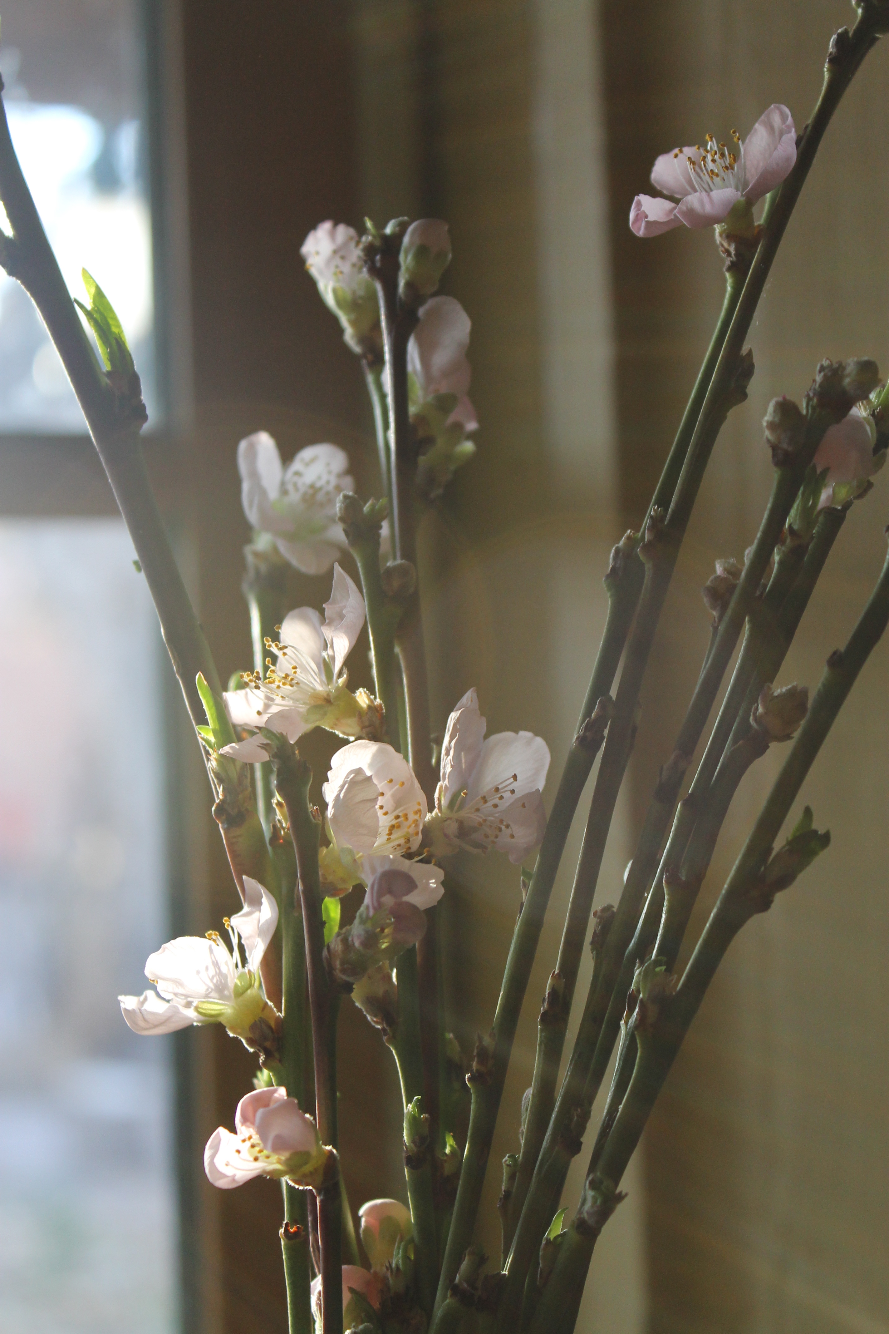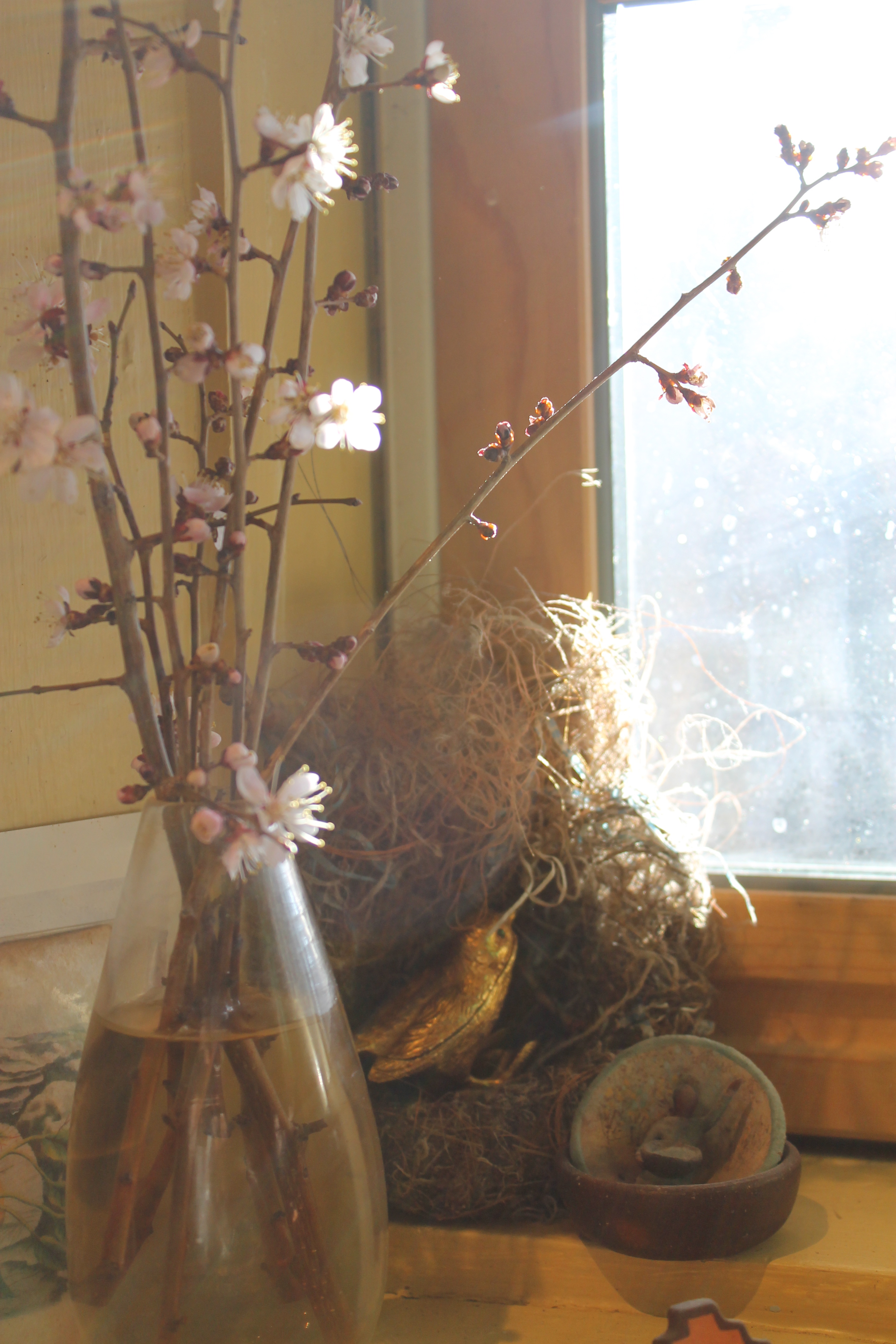 The prunings from the Apricot and Peach are pushing blooms in our window sill