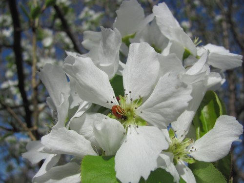 Pears have large white blossoms with fewer in a bunch than other blooms right now. Pear trees are often tall and skinny, pruned to have one thick branch at the middle like a christmas tree, called the central leader