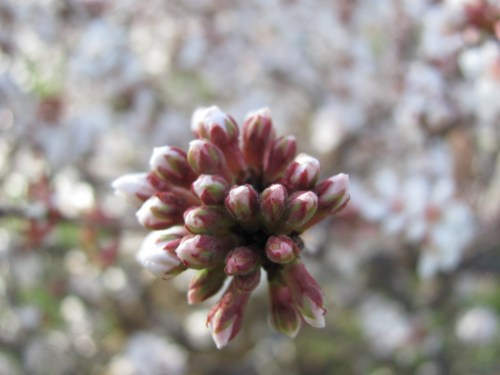 The next to bloom are the Shrub Cherries, which are bushes really, producing clusters of tiny cherries that the birds love– great for hedgerows and wildlife habitat, & tasty too…these are Nan King Cherries
