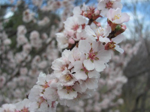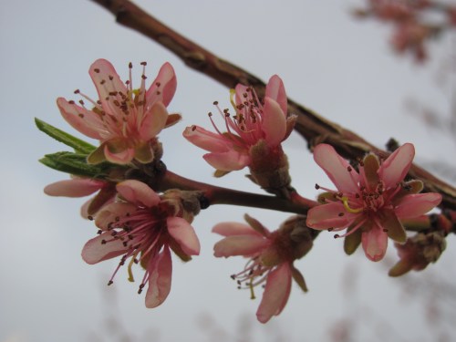 ApricotsBloom first, light pink, almost white petals with very rich red pink sepals that are very distinct after petals fall, creating a dark pinkish red glow. They are often bigger than other fruit trees, and even when young have a distinctly tree shape with a few thick branches and the rest smaller