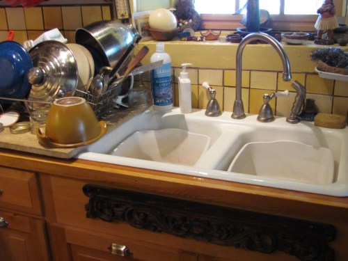 And of course the Dishwater. Yep– year round, every day, sometimes twice a day this garden gets oh, maybe 4 gallons of dishwater dumped here and there. I let the days dishes gather, neatly by the sink, organize from cleanest to dirtiest. When the time comes, either in the quiet of evening or along with morning coffee, but strictly ONCE a day, (who wants to do dishes more than once a day?) I fill up my bins, squirt a little sodium free soap in and wash. When complete, I dump the bins out the front door and begin the dish gather again.