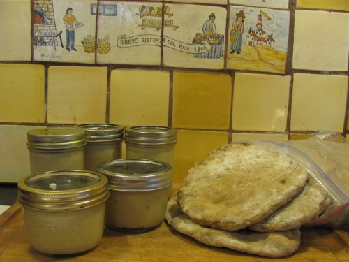 The idea behind all this of course, is you spend a day in the kitchen and then freeze your picnic ready snacks so you can grab them, throw them in the picnic basket and by the time everyone is hungry, food is thawed and perfect for munching.  These recipes are for Killer Hummus, Pita from scratch, and Whole Wheat Sourdough Pita, as I am a big sourdough fan.