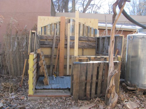 I decided to do a modern twist on the traditional jacal technique of Northern New Mexico. Upright posts are set in the ground and the whole thing is plastered over with mud. Instead we used wooden pallets and filled and plastered them with strawy mud. Using four portland cement pallets (very strong), a 4’x 8’ “ pallet for plywood, five pallets from a cabinet shop, and miscellaneous pallets from behind the hardware store, I pieced together the walls. First redwood 2 x 4 plates were screwed to the concrete slab using tapcon screws. The pallets were attached with scrap pieces of 2×4 screwed flat to the plate that keyed into the voids in the pallets. Short pieces of scrap 2x 4 also tied the pallets to one another.