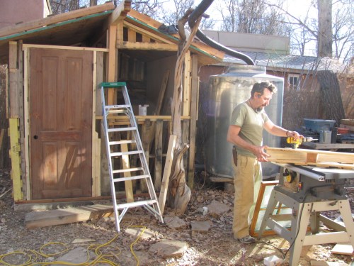 When my wife and I were expecting a baby, and my shop was too full of stuff to work in, we decided to build a shed on top of the concrete slab roof of the well house. We’d been using it as root cellar for a couple of years and also needed a pantry and a place for the used sunfrost freezer we’d bought. Our goal was to build an attractive (it is right outside our living room window) temperature-stable, weather tight structure using as much waste material as possible. It also turned out as a good way to use up scrap wood cluttering the yard.