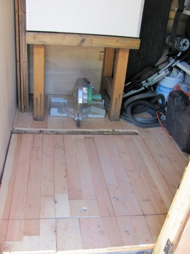 Using a pallet base, a floor of douglas fir seconds was installed along with a ladder and trap door to make the root cellar more accessible. The building including electrical cost about $500 mostly for metal roofing. Many have said that would be a great extra bedroom. The big front and side overhangs make the building.- Joel Glanzberg