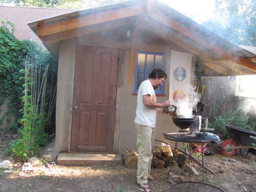You see it all started last March 2011…Baby was on his way and we needed to turn the studio/storage room into kids room….So while I sat, very pregnant watching…Joel built us this little number from some old pallets picked up behind the hardware store, some mud and straw (instead of a baby shower we had a cob party!! Thanks Everyone) insulted the roof with packing peanuts, (that thrifty guy), and finished it off with a marvelous over hanging roof that added outside storage and of course shade, nothing says loving like a porch!!