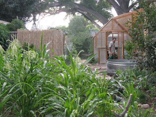 A sharp turn to the north and you will find hundreds of gallons of rainwater being collected for dry days ahead. And yes that is a Chicago fig gifted to me from my friends mom, but it dies back every year and only produces a few figs, but it’s cool so we keep it around, who knows, maybe someday the climate will change so much it will thrive year round ( the bright side right?)