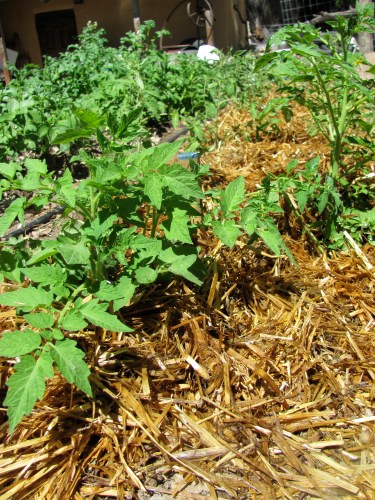 Mulch suppresses weeds so you don’t have to worry about them. It keeps in moisture so you water much less and builds up organic material in your soil. If you do have weeds, let them be if they aren’t encroaching in precious vegetables. Just change how you see them , call them cover crops, call them water catchment, call them green in the desert. If they are getting in your veggies way, pull them up and lay them down right where they are and call them mulch. They will just dry up and look like straw anyway!!