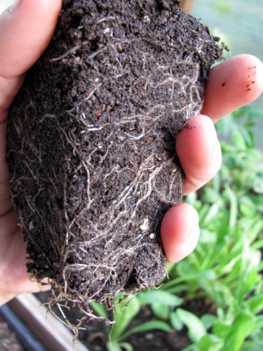 These are cool season crops started in the greenhouse, ready to have more space!! I divide them ever so carefully and placed them individually in the ground.