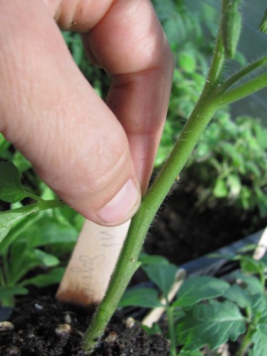 The finer you go, the tilth better for your seeds. And the more even you go the more consistently moistened when watered. Now this stage seems to be the most appealing for toddlers to step right in the make their mark… So I baby trapped the bed by putting in a few stakes and wrapping with twine about a foot or two high. This seems to work well for a person of 22 months– though past 2 years they can just hurdle it with ease– I guess I will cross that bridge when we come to it.